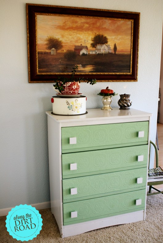 I decided to apply some of that wall paper that looks like old ceiling tiles to the fronts of the drawers. Then I painted it a wonderful antique-y green color…that was actually left from our master bathroom. My friend Jodi actually did this wall paper on her ceiling and it looks amazing. She lives in a wonderful, old, two-story house. That is another story for another day though.