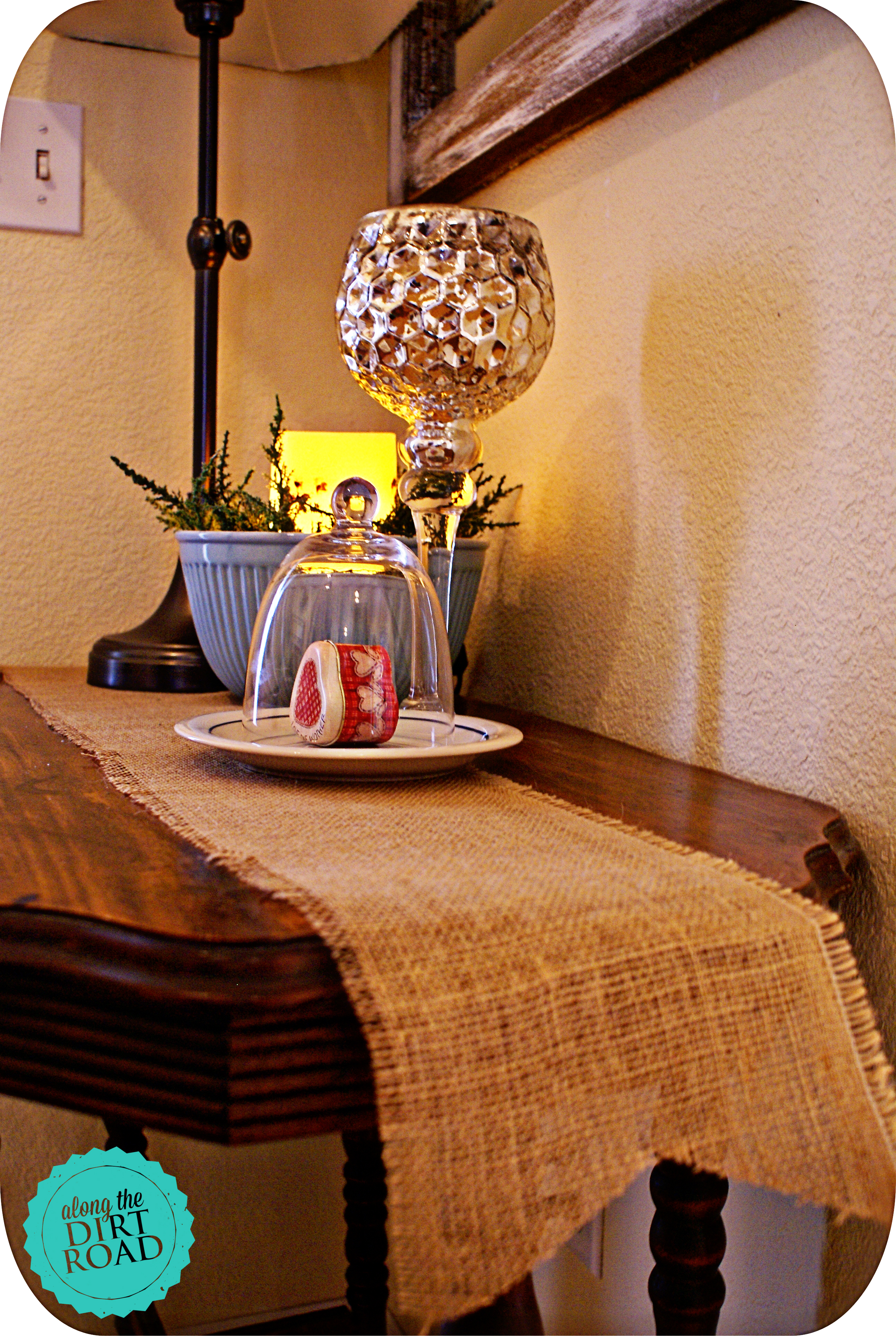 My hutch has a long story about two young people with a little blonde headed child. They were so excited in a furniture store…once upon a time. I have seriously thought about getting rid of it and going with a buffet, but I am a tad on the sentimental side. It’s not a high dollar piece…but I still love it. I revamped it a little…by painting the oak with some white paint that we already had. The Mr. also had some glue that we used to put the table cloth on. Thus…a five dollar hutch makeover. Drumroll please…