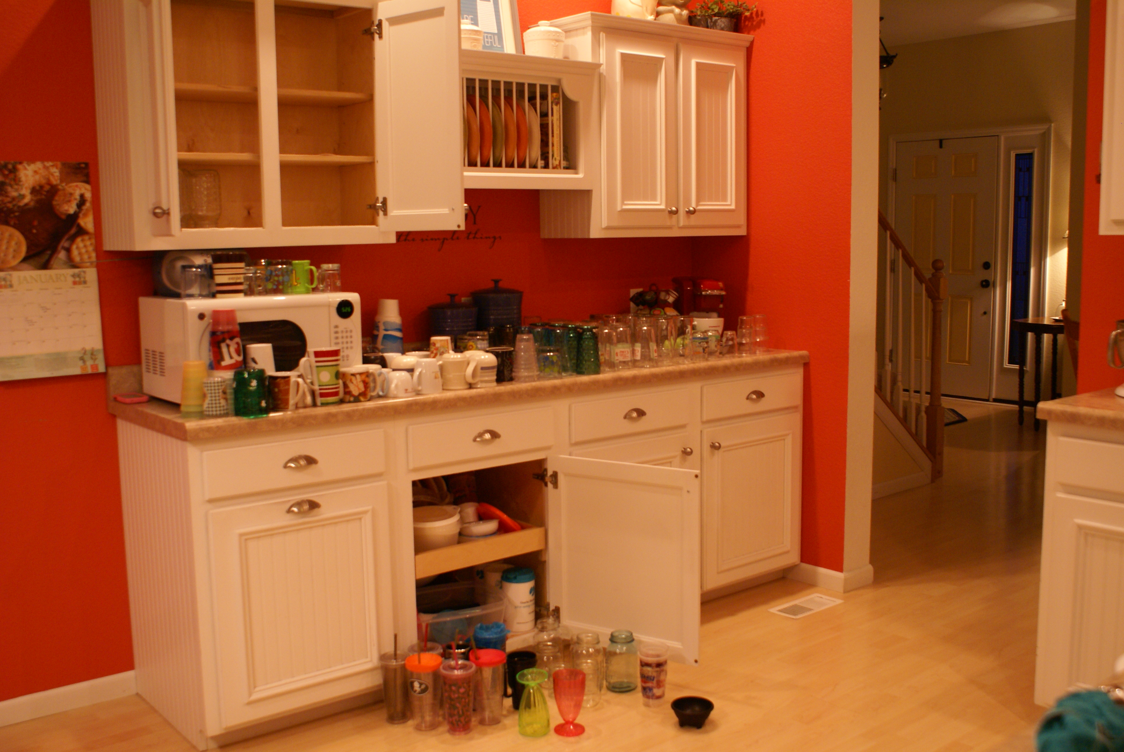 I am hanging my head in shame.  Not really, but I kinda feel like it.  Today, I am going to share with you, my sweet Dirt Roaders, something ridiculous.  It is our glass and cup collection.  Really now?  A family of five need a bazillion and a half drinking glasses and cups?  Please tell me that we are joking.  It’s nuts!