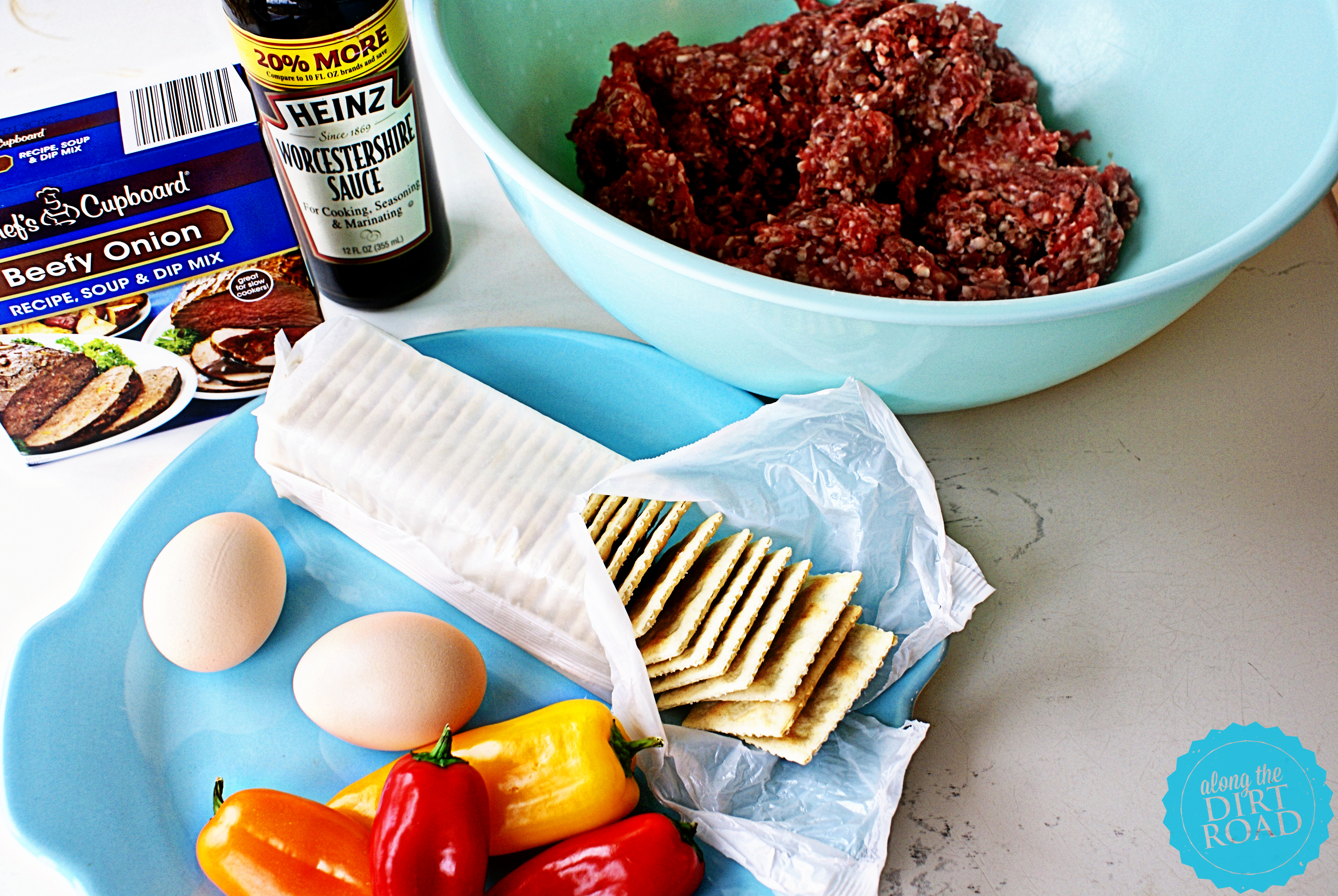 Preheat oven to 400 degrees. Put ground beef in a large bowl that gives you plenty of room for squishing. Beat eggs and then add to beef. Add onion soup mix. You can chop as much green pepper as you like and then add it to the bowl. (Some people may like less or more.) As for adding the crackers…you kind of have to eyeball it. Maybe about half a sleeve and then if it’s still a little too moist add more. You need to crush them up into fine crumbs. (I think that Sandy told me to use oats…and I have done both. Which ever you like is fine. It doesn’t alter the taste.) Salt and pepper….just a dash of both. When adding the Country Bobs…you might just do a couple of tablespoons. You don’t want to add too much moisture. Also…it’s totally okay to leave this out. It’s good both ways. Then……just SQUISH…and squish and squish…until everything is incorporated. Shape into a loaf and then brush ketchup on the top. I do a pretty thick layer. Pop it in the over for forty-five minutes. Take it out…add another layer of ketchup and bake fifteen more minutes. YUMOLA!