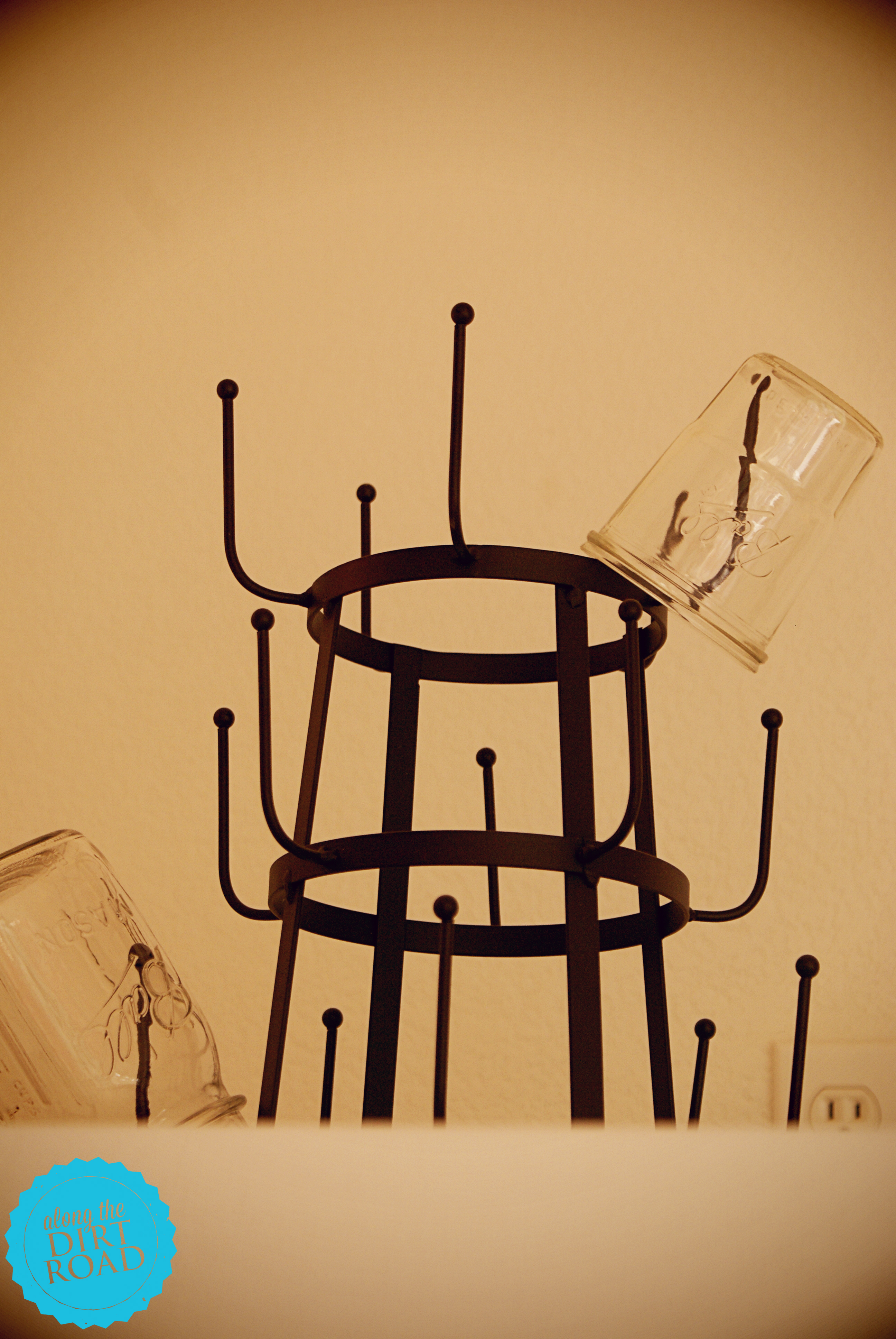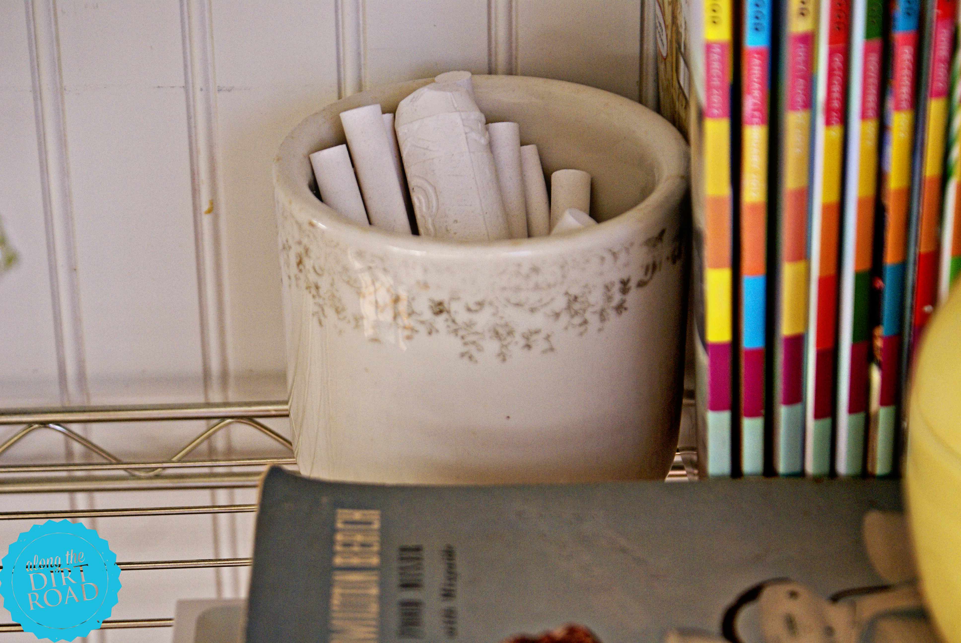 Want the low down on some of the junk in my kitchen? Okay. Here goes. That little mug holding chalk? It’s an old shaving mug that I found at a yard sale. It actually says “Father” in gold. Yeah…I turned that around. Um….the bundt cake pan (Quit laughing MIL.) was from…my MIL. It has been hanging there since our home was built. The old locker basket was picked up at a yard sale. I love those. I am on the look out for more. The hobnail glass lamp came from…wait for it……..ReStore!