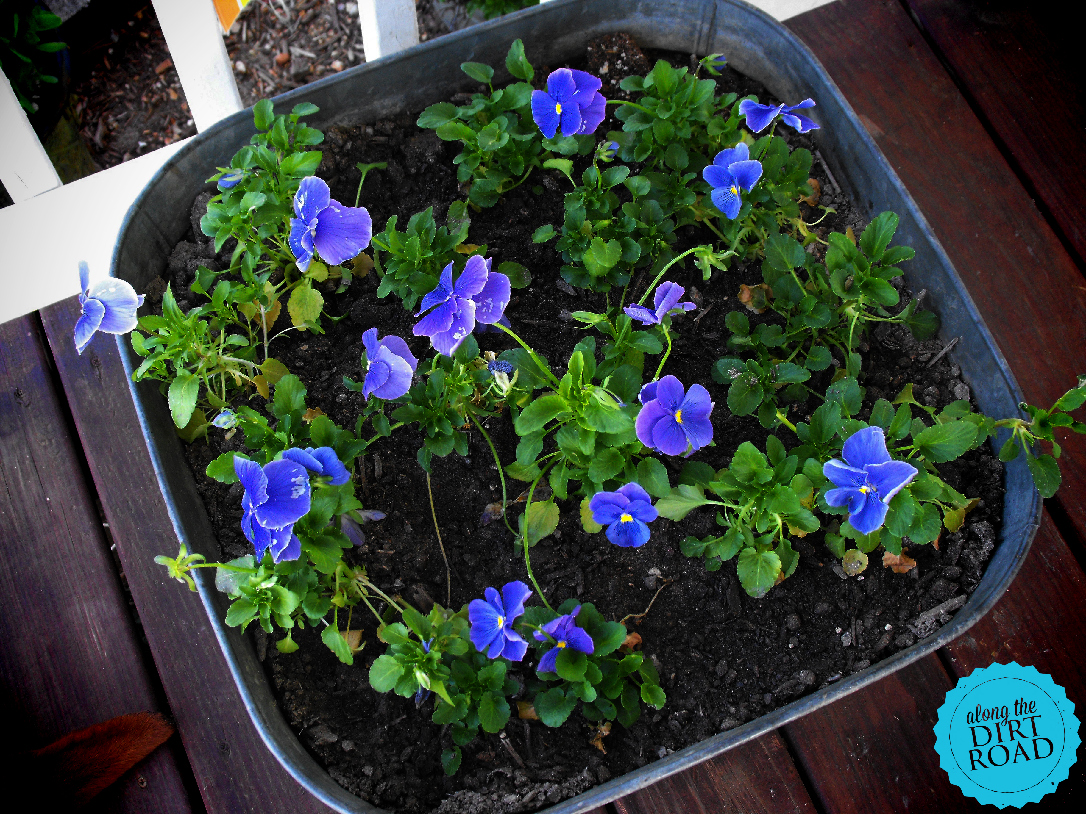 So I was at Wal-Mart with the Mr. and I spotted these beautiful, faded, purplish-bluish pansies. When I saw them I thought of country roads and little grandmas with aprons and all things cozy and farmhousey. I knew that they would look amazing in the old wash tub that Mom gave me. (There is the junk that we were waiting for.) I also have a thing for old wash tubs. Greenhouses and wash tubs, who knew?