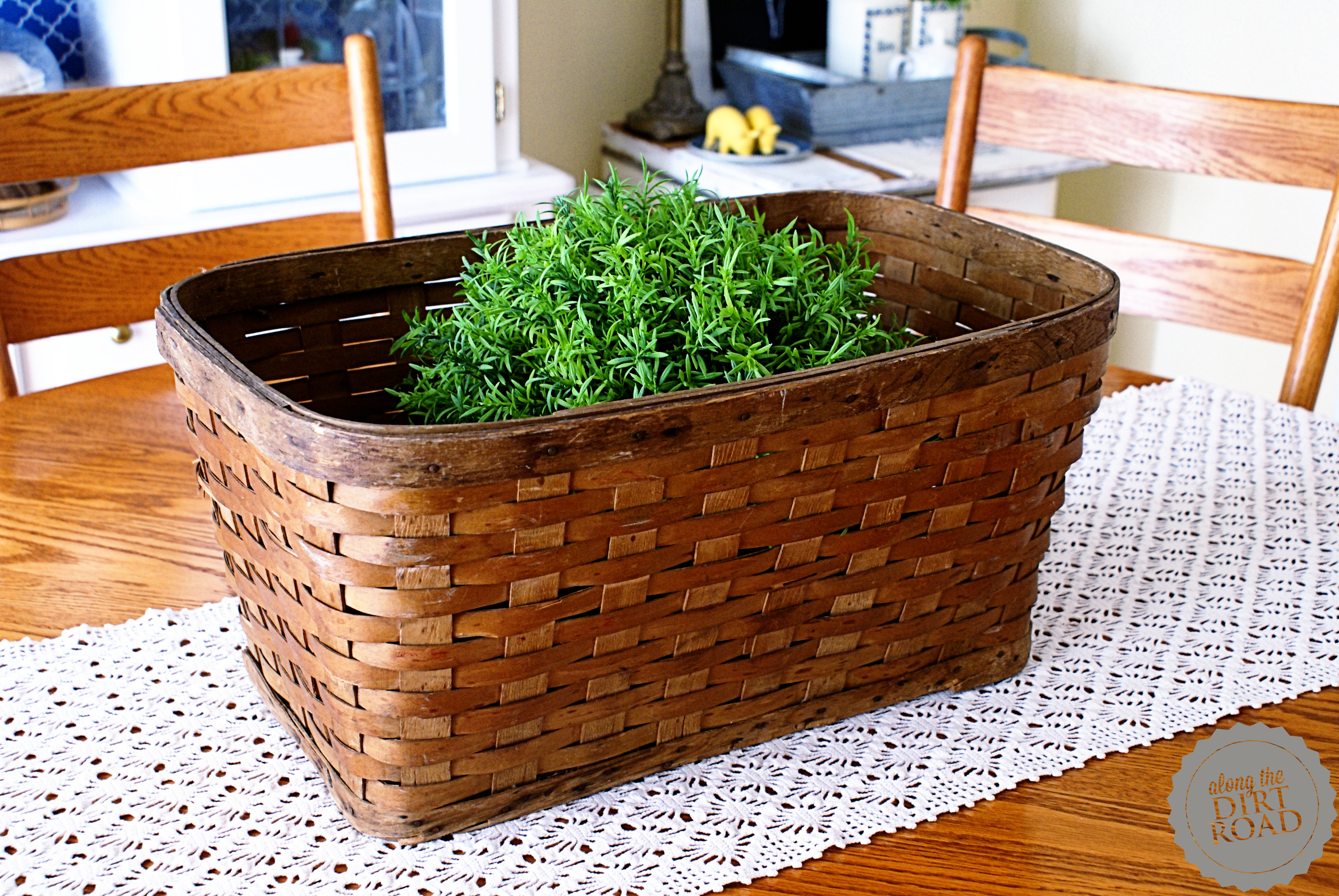 I am crazy about the basket that I picked up at a yard sale.  It does not have sentimental value…but it was a bargain and that is a biggie for me.  Old baskets seem to whisper a story of a time when things were actually used…not just a part of the decor.  So…it brings me aesthetic happiness.  It gives a feeling of another time.  I love that.  The little yellow doily, under my fun Target lamp, was sent to me, by one of my sweet Instagram friends.  It was just the pop of mustard that I needed…at a really hard time.  I don’t know what my deal with yellow is…but it has been color therapy over the last few months.  Lastly, the feed sack pillow is such a sweet little testament of the things that have been going on, this spring, at the Farmhouse.  Fencing and cattle and more goats and all of the things that are proof of a little dream…coming true.