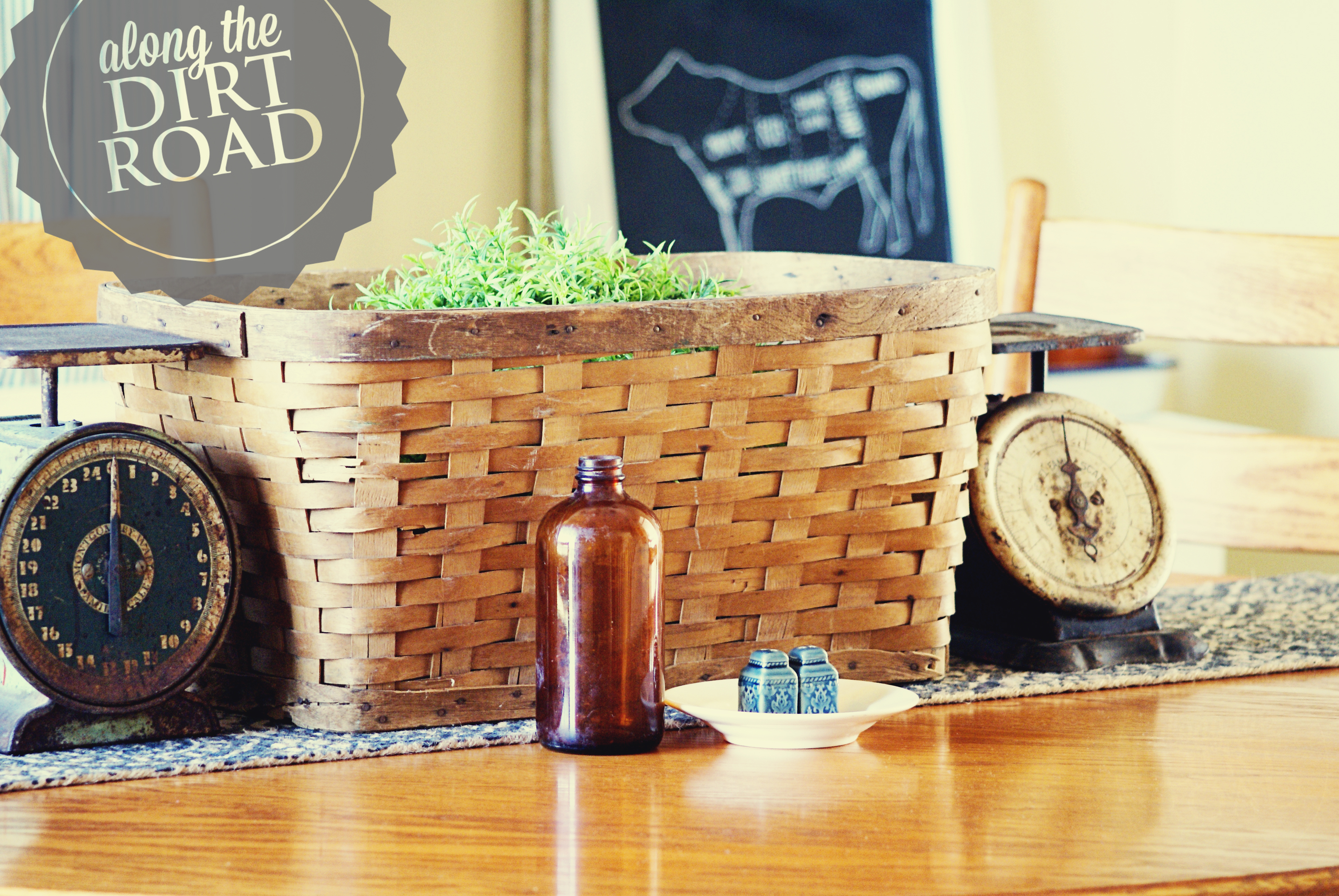 I wanted to give you something to gaze “uponst” that would reflect who I am.  At this point…and always I have a heart for old things.  I am also loving the warmth that wood is bringing to farmhouse style lately.  Of course, I enjoy it paired with white.  Don’t sign me up for paneling just yet.  😉  Baskets are a no-brainer and the itty bitty salt and pepper shakers are from my mom.  They are so me.  She knew that they were when she picked them up at good ol’ Cracker Barrel.  Then there is the amber bottle.  Those are catching my eye… a lot.  I checked Ebay for the apothecary bottles in amber.  Eeeeeep!  Gotta strike oil first. The blue runner?  Well…it’s blue.  Blue has always been my favorite color in the crayon box.   Anyway…just a bit of what makes my little junkin’ heart go pitter patter.  I had to cozy it up a bit for us here at Along the Dirt Road.  It’s that time of year.