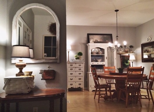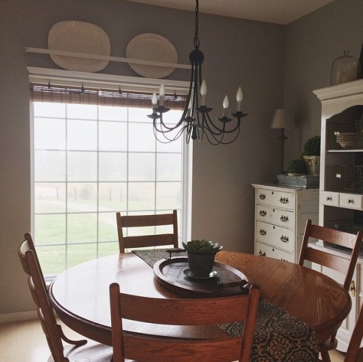 Totally not about my hair…although that is happening too.  I was wanting to update our dining room.  I was a bit tired of the Meringue Peaks. (Yellowish.) So after lots of thought…we went with Secret Locket by Glidden.  Actually…true to form…I had them doctor it a bit with a few squirts of white.  Momma knows…what Momma can live with. 😉 By the way…one tip before we get started:  If you want a true gray…pick from the card with black at the bottom.  If the darkest shade on your card has blue or purple or a brownish gray…your lighter shade will have that cast.  You already knew that?  Of course you did.  Dirt Roaders are smart.