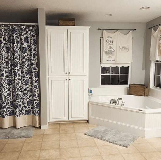 I was over the Spa Blue. It had actually been with us for eight years. Crazy!!! Time really flies. Also…some of the bathroom hadn’t been painted since we built. Sooo…I introduce you to Pebble Gray.