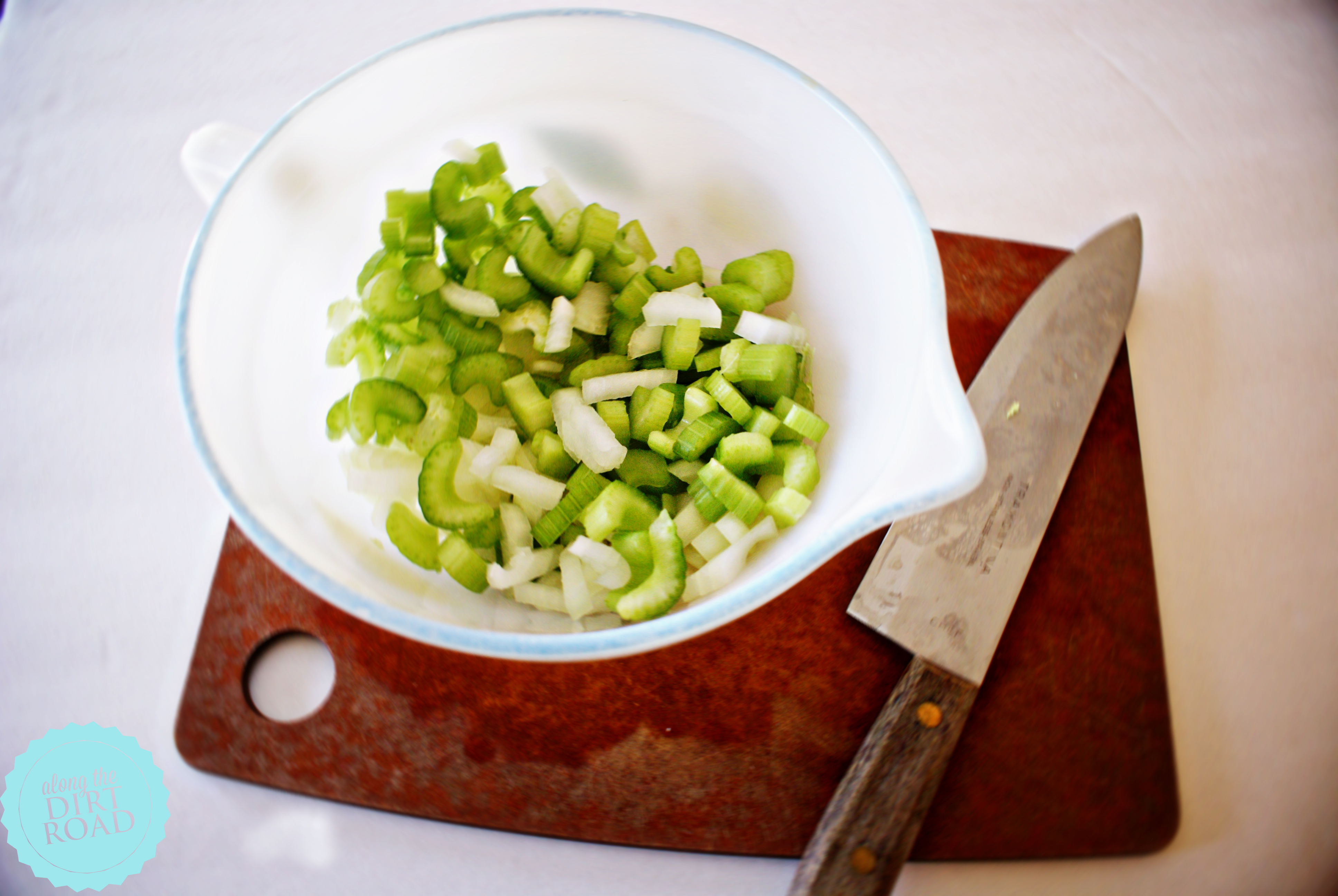 Cover chicken leg quarters in water. Use enough to make plenty of broth for your soup. While that is cooking, dice your veggies. In this soup I used cabbage, onion, and carrots. You could add minced garlic or anything green…or….you get it. 😉